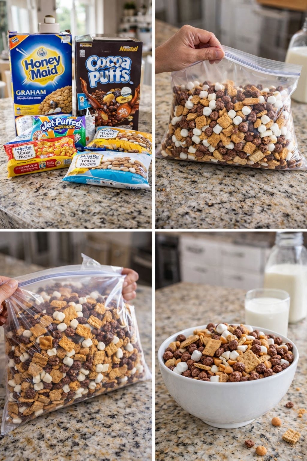 - Combine cereal, marshmallows, graham crackers, and chocolate chips in a bowl.