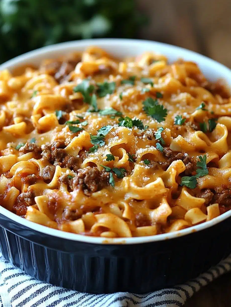 Egg noodles add a comforting, chewy texture, and the melted cheese on top makes it irresistibly gooey and satisfying.