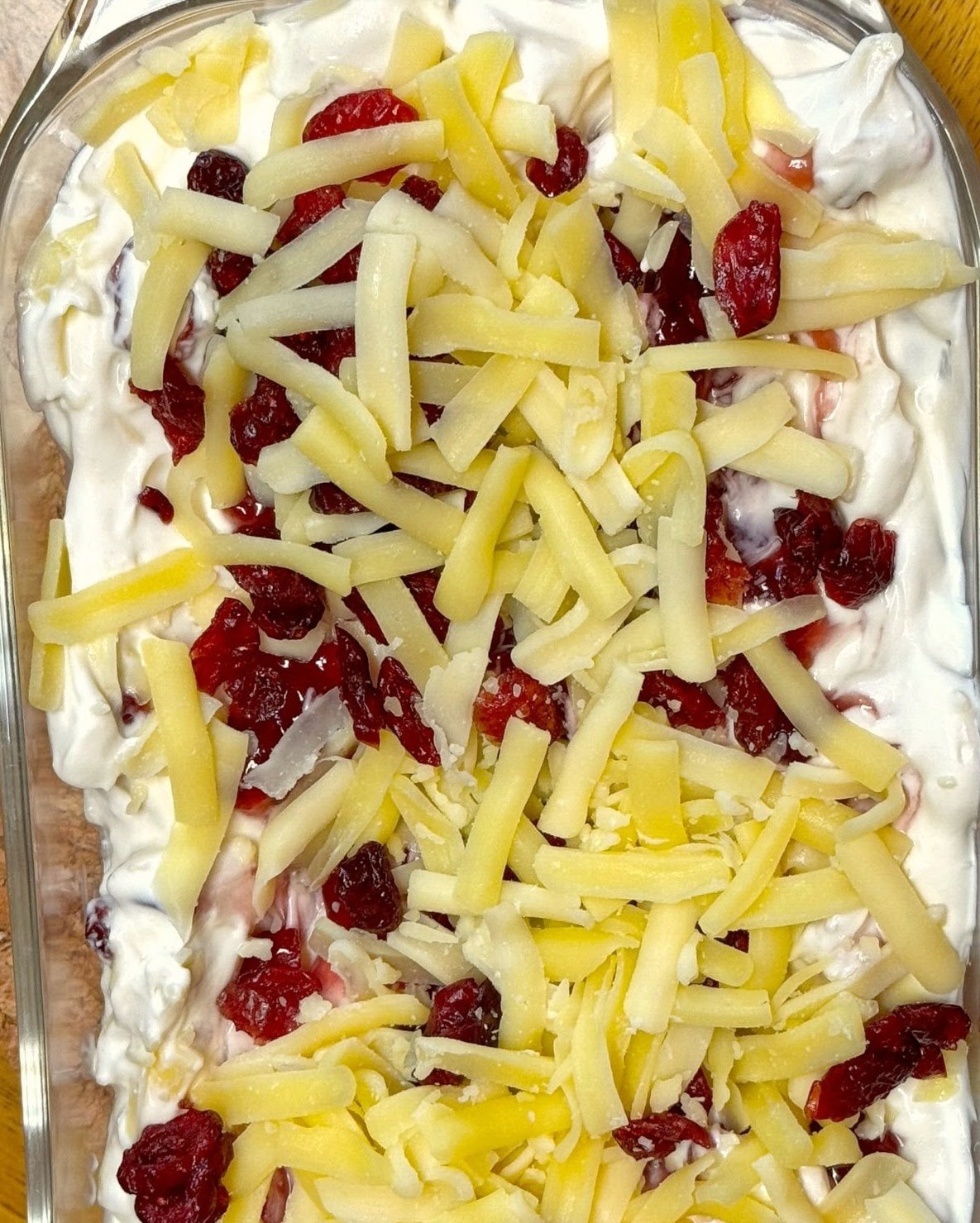 - Top with remaining cheese and cranberries.