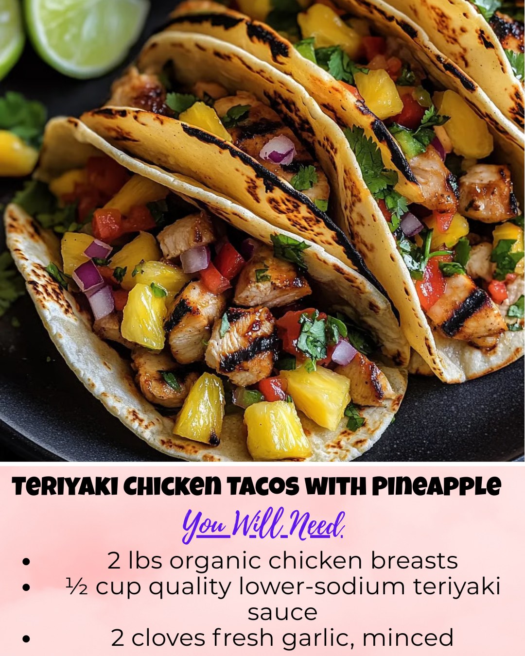 Unlike traditional tacos, this version blends savory teriyaki flavors with fresh tropical ingredients. The grilled pineapple adds caramelized sweetness, while the pear contributes crisp freshness and natural juice. Together they create a salsa that complements the smoky chicken beautifully.