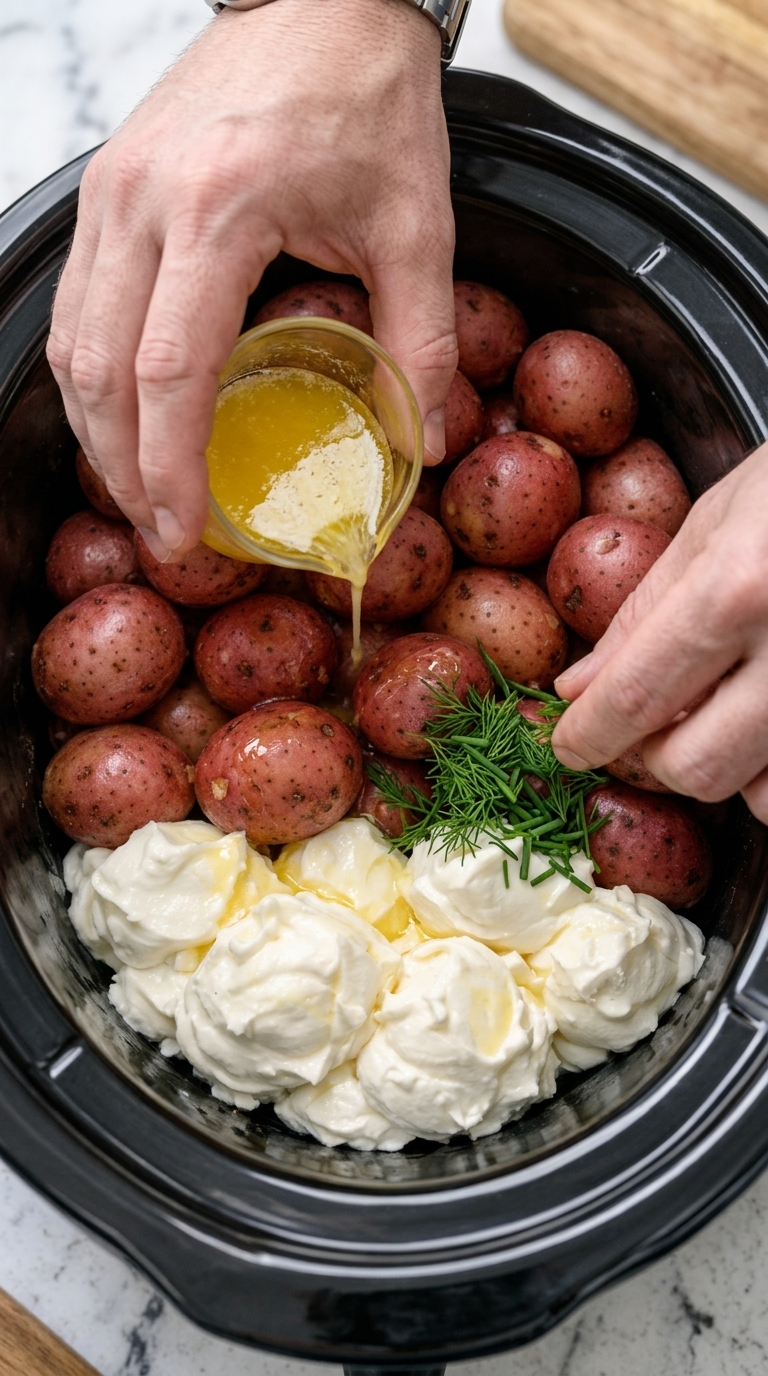 - Add baby potatoes to slow cooker.